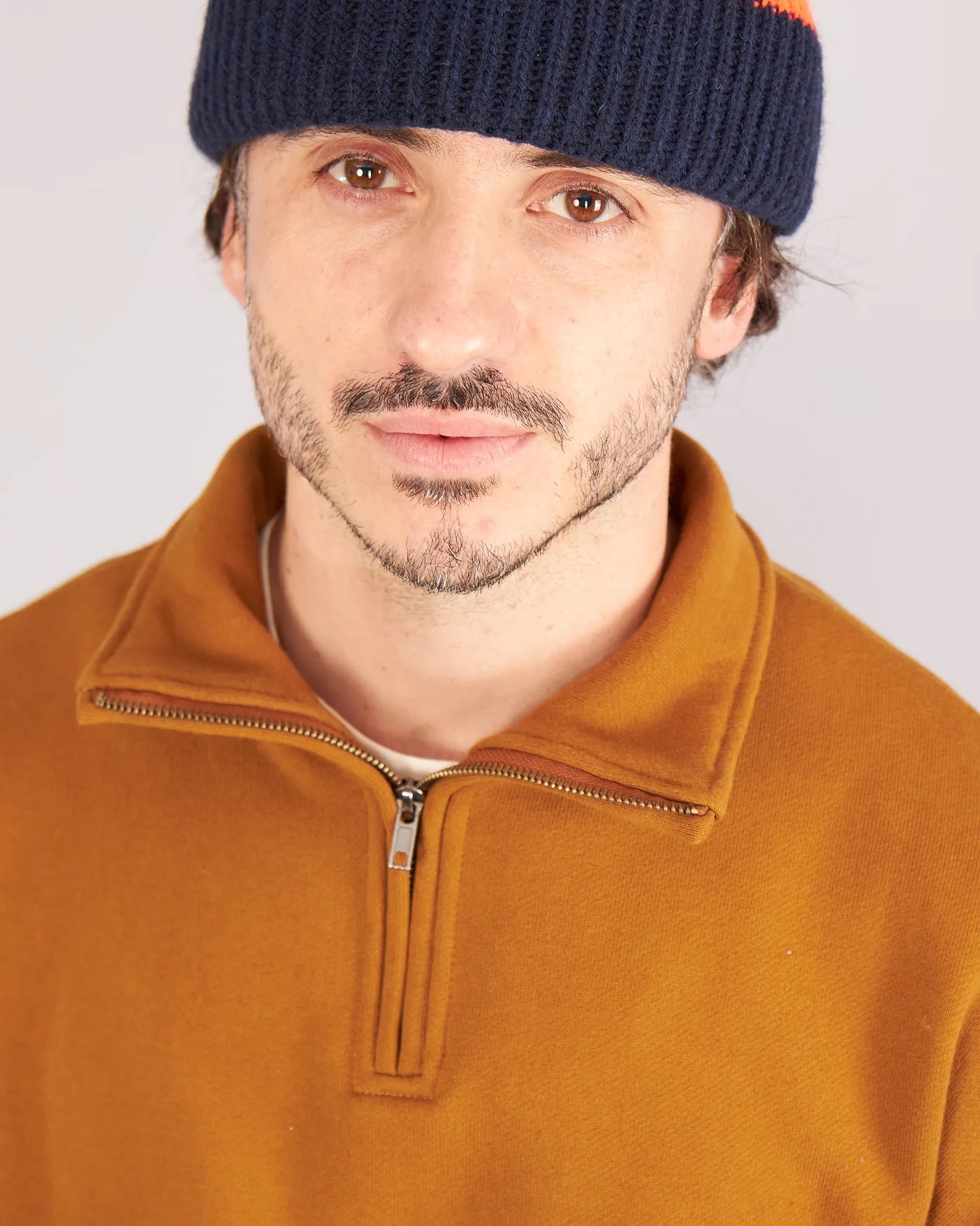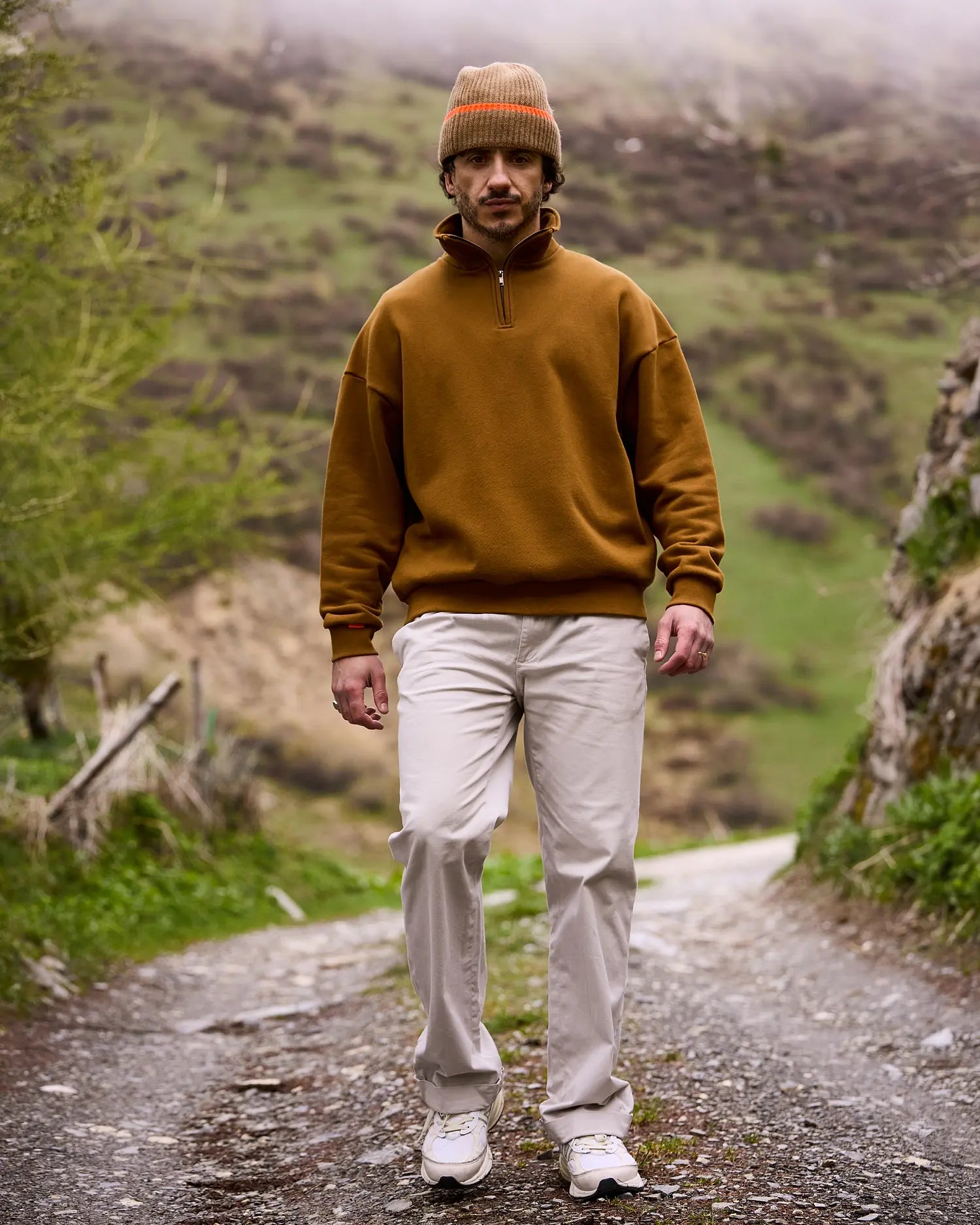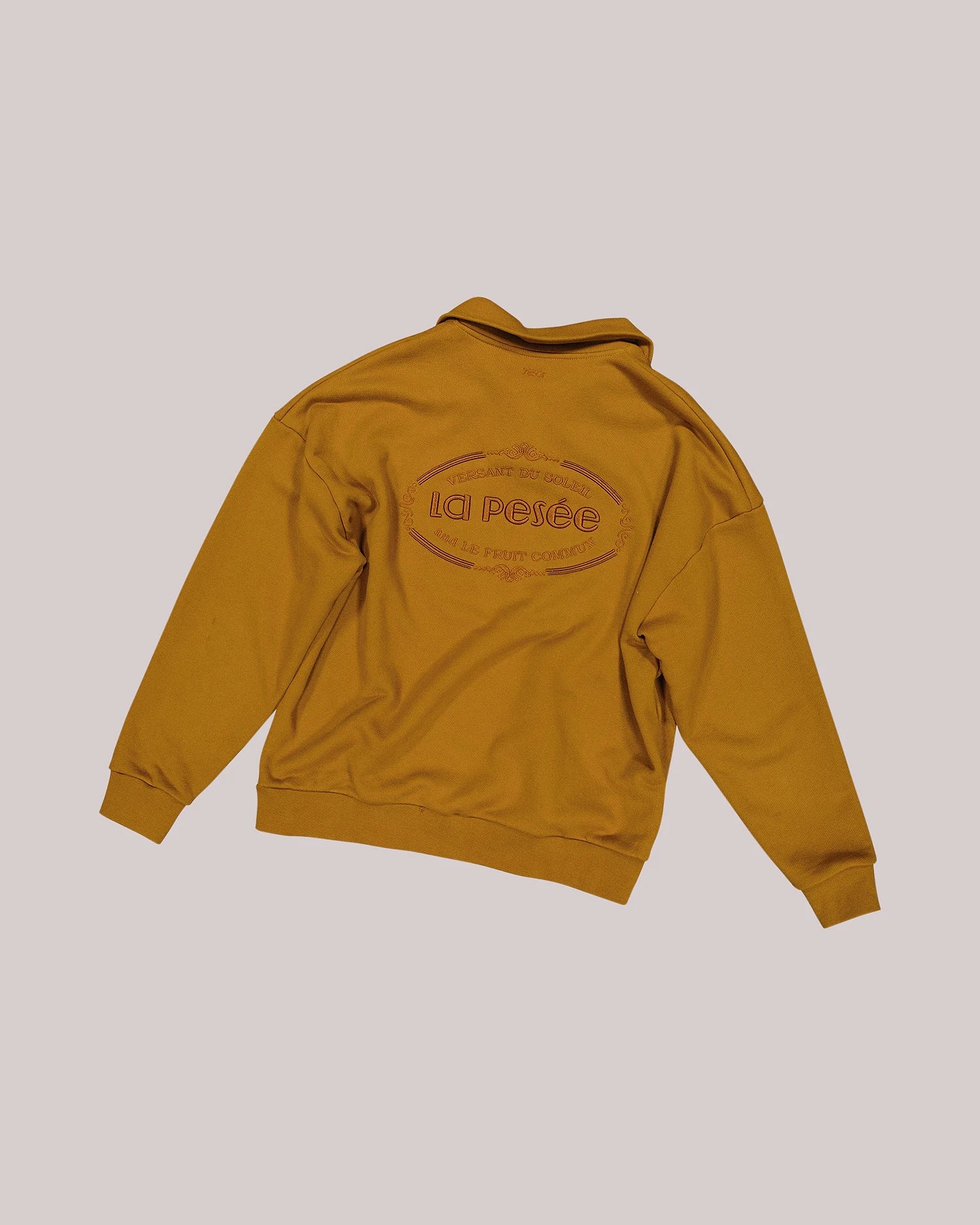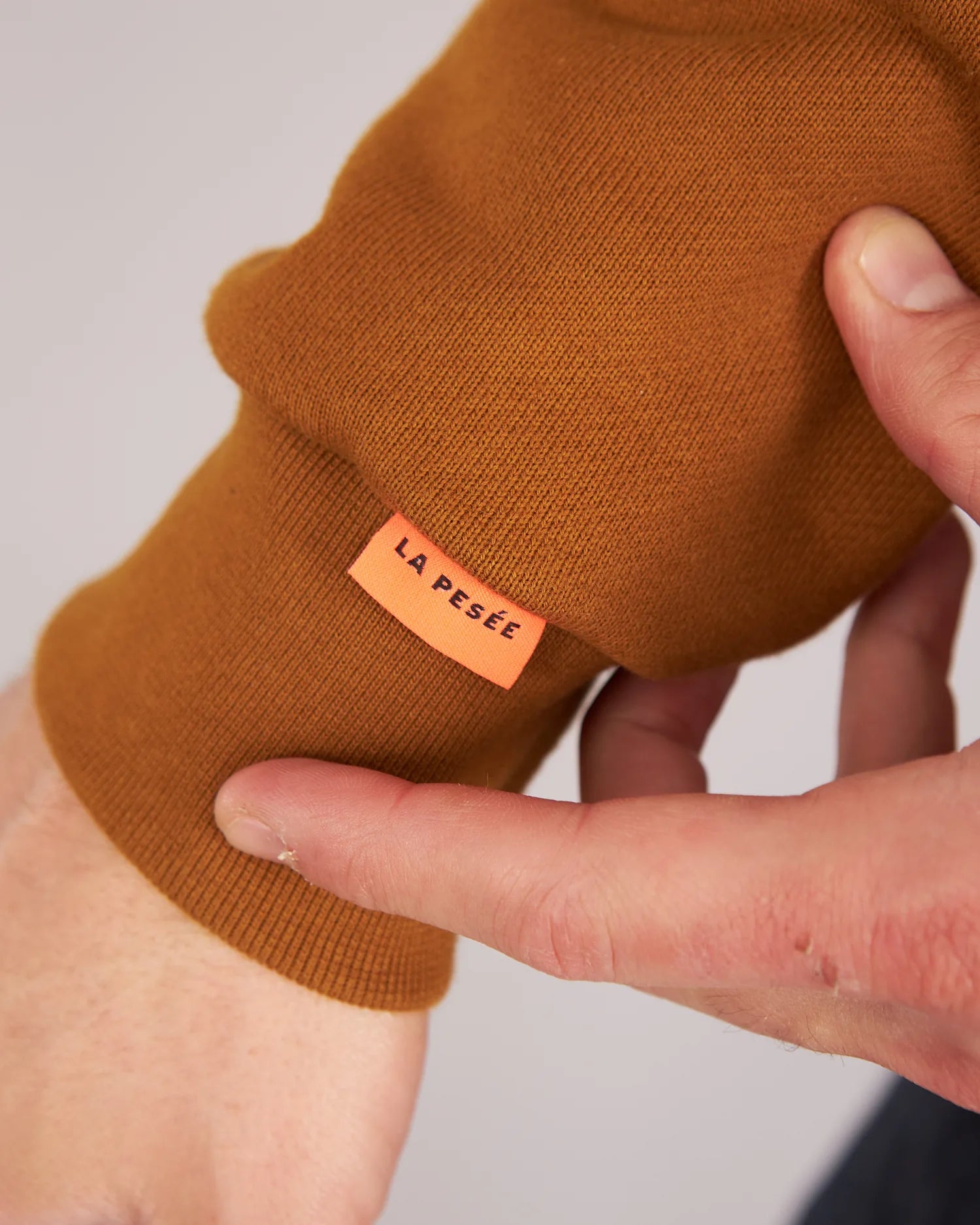 Un pull pensé pour durer et accompagner les saisons froides. Inspiré des médaillons agricoles, le camionneur plaqué incarne l’héritage utilitaire. Nous avons voulu dépoussiérer le camionneur classique en lui donnant une coupe oversize et donc plus de prestance. Son col zippé se module et s’adapte aux mouvements, tandis que sa couleur chaude s’inspire des teintes de montagne en automne.
