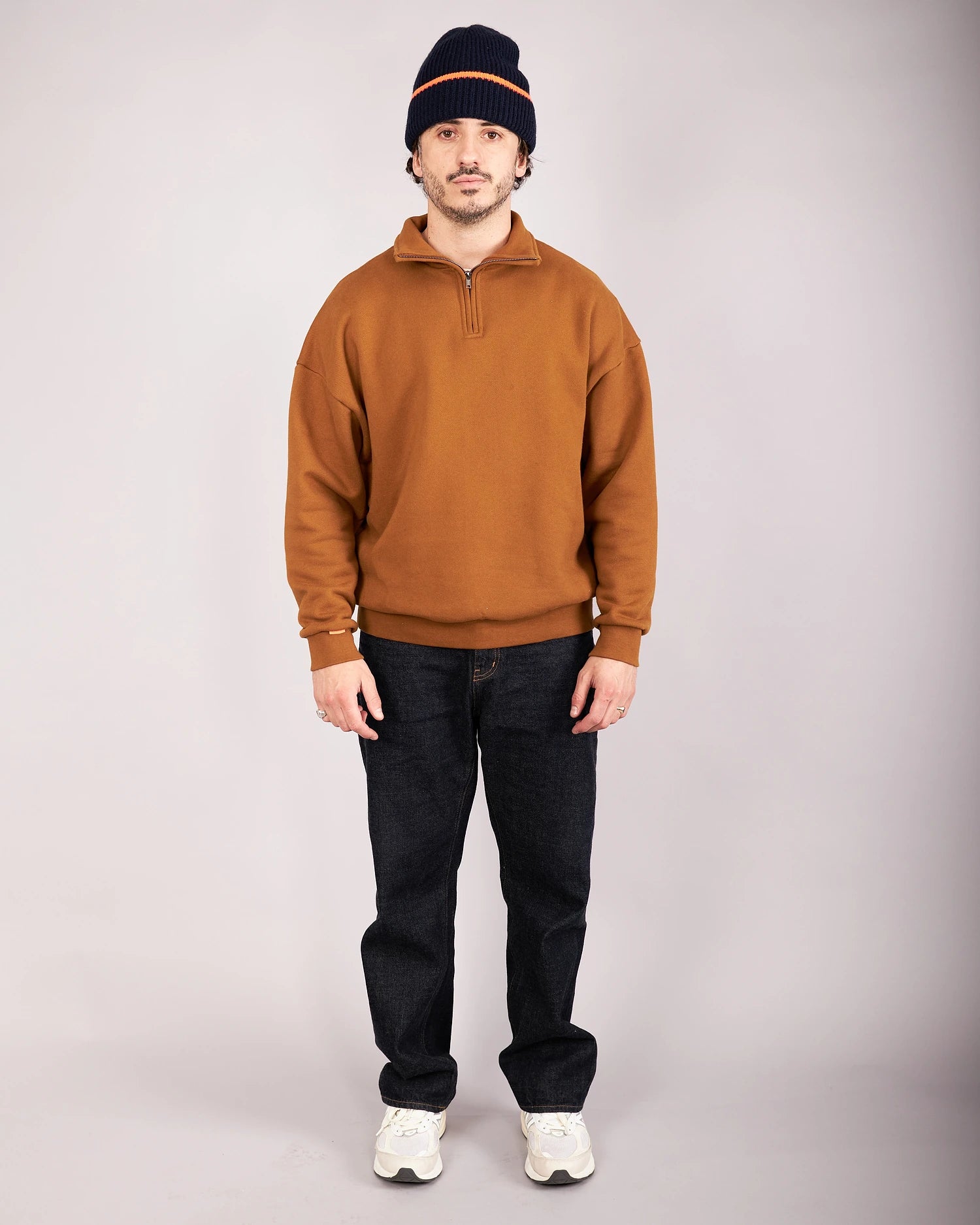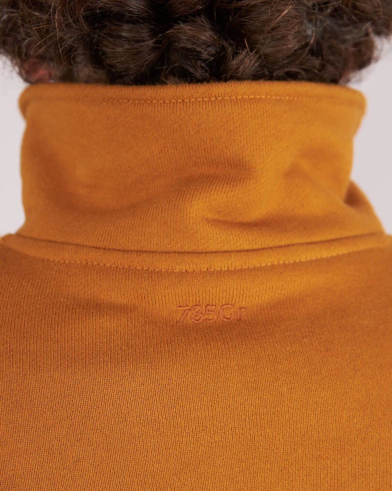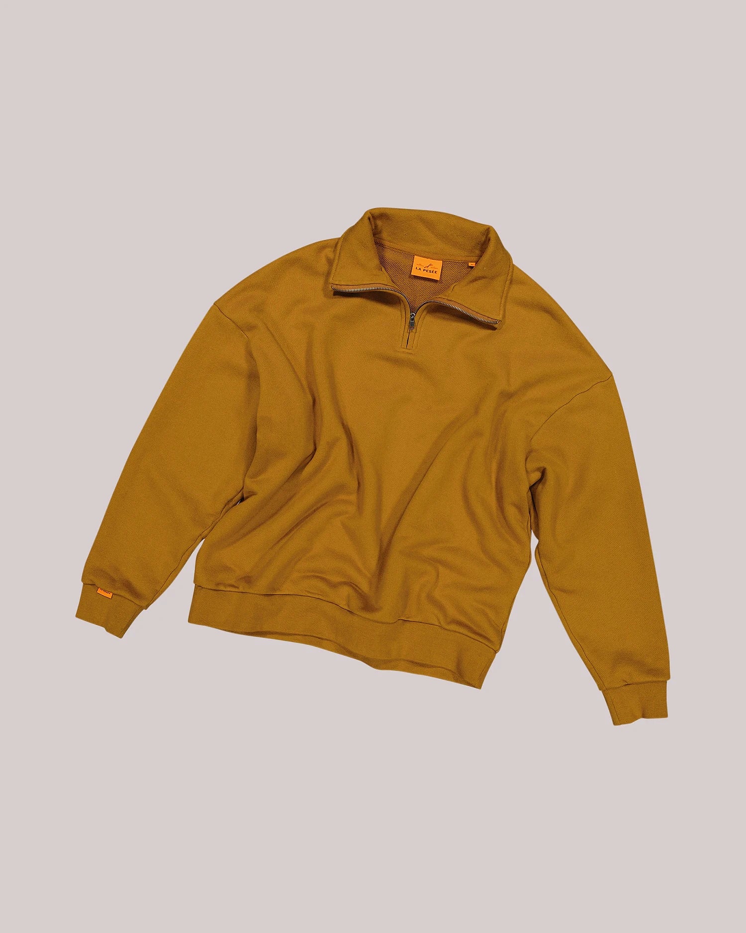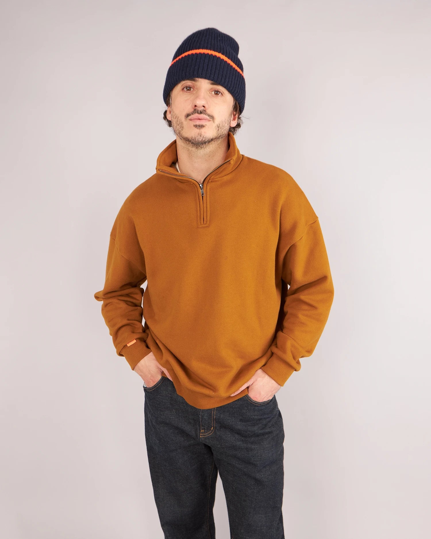 Un pull pensé pour durer et accompagner les saisons froides. Inspiré des médaillons agricoles, le camionneur plaqué incarne l’héritage utilitaire. Nous avons voulu dépoussiérer le camionneur classique en lui donnant une coupe oversize et donc plus de prestance. Son col zippé se module et s’adapte aux mouvements, tandis que sa couleur chaude s’inspire des teintes de montagne en automne.